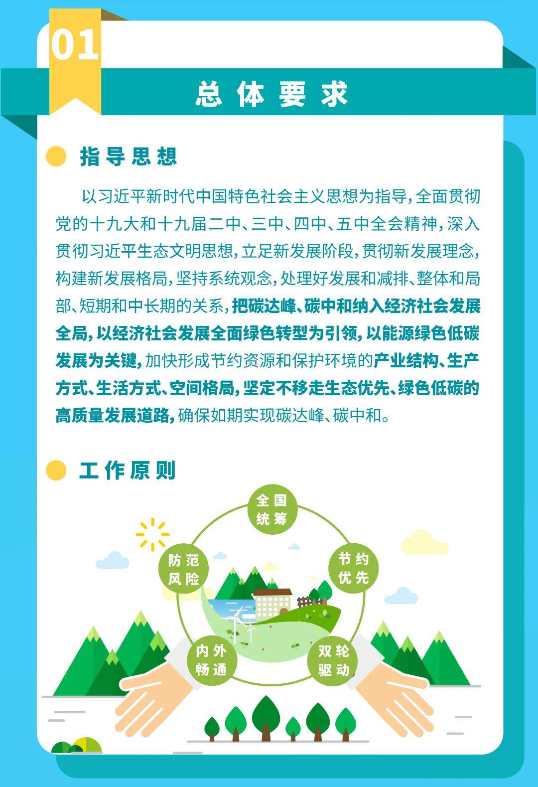 (一)指导思想。以习近平新时代中国特色社会主义思想为指导,全面贯彻党的十九大和十九届二中、三中、四中、五中全会精神,深入贯彻习近平生态文明思想,立足新发展阶段,贯彻新发展理念,构建新发展格局,坚持系统观念,处理好发展和减排、整体和局部、短期和中长期的关系,把碳达峰、碳中和纳入经济社会发展全局,以经济社会发展全面绿色转型为引领,以能源绿色低碳发展为关键,加快形成节约资源和保护环境的产业结构、生产方式、生活方式、空间格局,坚定不移走生态优先、绿色低碳的高质量发展道路,确保如期实现碳达峰、碳中和。