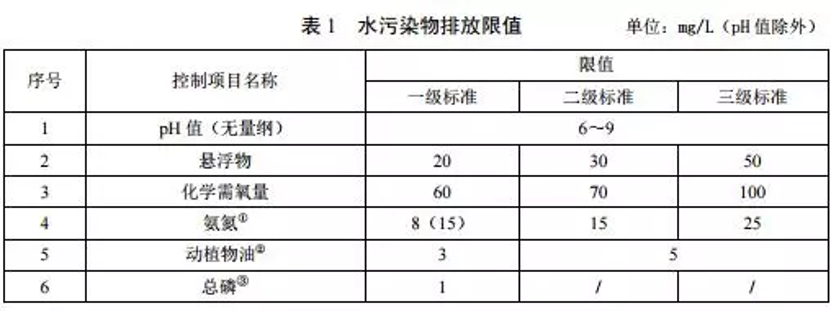 标准选取pH值、化学需氧量、生化需氧量、悬浮物、总氮、氨氮、总磷、阴离子表面活性剂、动植物油、粪大肠菌群数等指标。