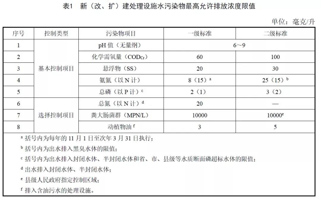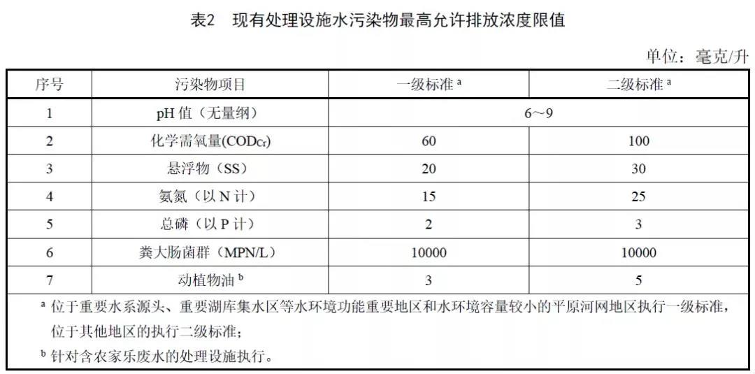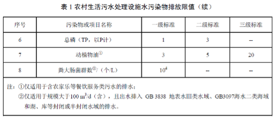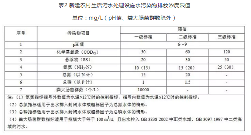 对于新(改、扩)建的农村生活污水处理设施,标准分一级、二级、三级等三档、一、二级标准又分为A、B标准,分别对应了不同的处理规模和排放去向。