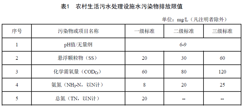标准选取pH值、悬浮物、化学需氧量、氨氮、总氮、总磷、动植物油等指标。适用处理规模在500吨/日以下的农村生活污水处理设施。