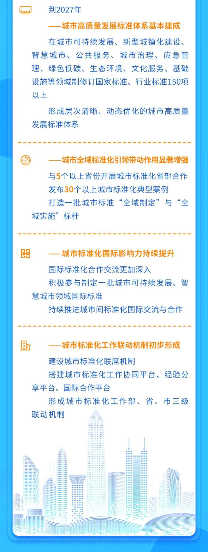 到2027年,城市高质量发展标准体系基本建成,在城市可持续发展、新型城镇化建设、智慧城市、公共服务、城市治理、应急管理、绿色低碳、生态环境、文化服务、基础设施等领域制修订国家标准、行业标准150项以上。城市全域标准化引领带动作用显著增强,与5个以上省份开展城市标准化省部合作,发布30个以上城市标准化典型案例。城市标准化国际影响力持续提升,积极参与制定一批城市可持续发展、智慧城市领域国际标准,举办城市标准化高端论坛,定期发布城市标准化发展白皮书,持续推进城市间标准化国际交流与合作。城市标准化工作联动机制初步形成,形成城市标准化工作部、省、市三级联动机制,建设城市标准化联席机制,搭建城市标准化工作协同平台、经验分享平台、国际合作平台。