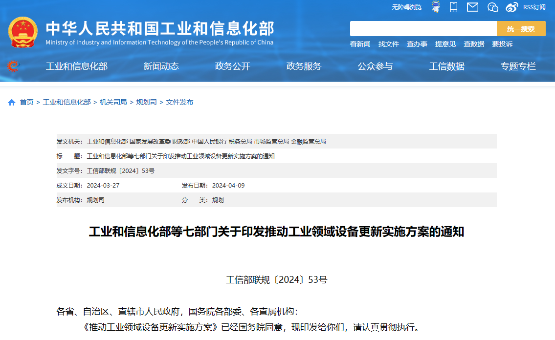 工业和信息化部等七部门印发《推动工业领域设备更新实施方案》