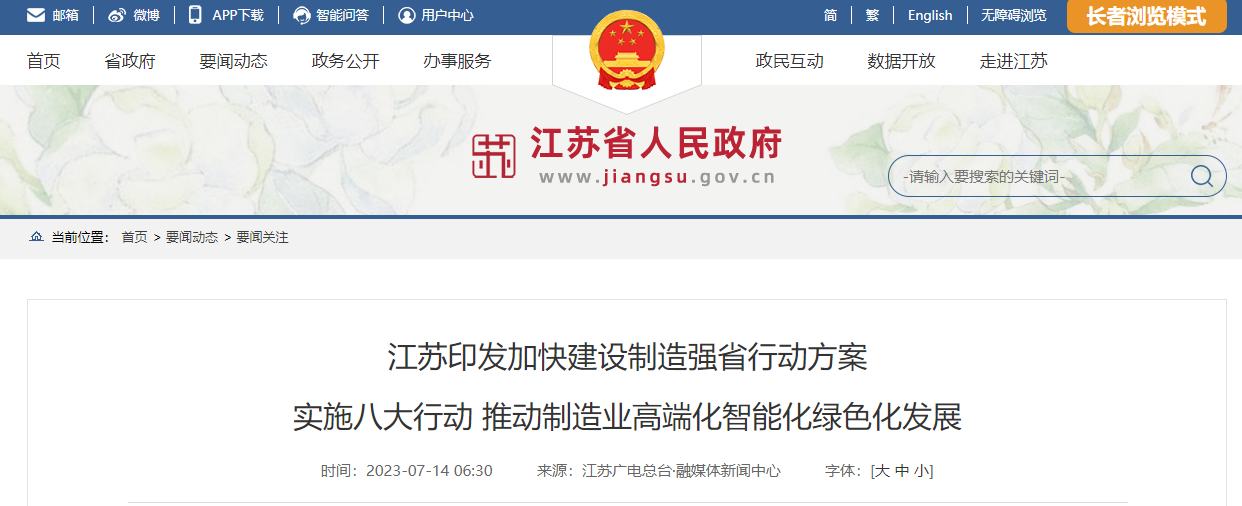 江苏印发《加快建设制造强省行动方案》,实施八大行动,推动制造业高端化智能化绿色化发展