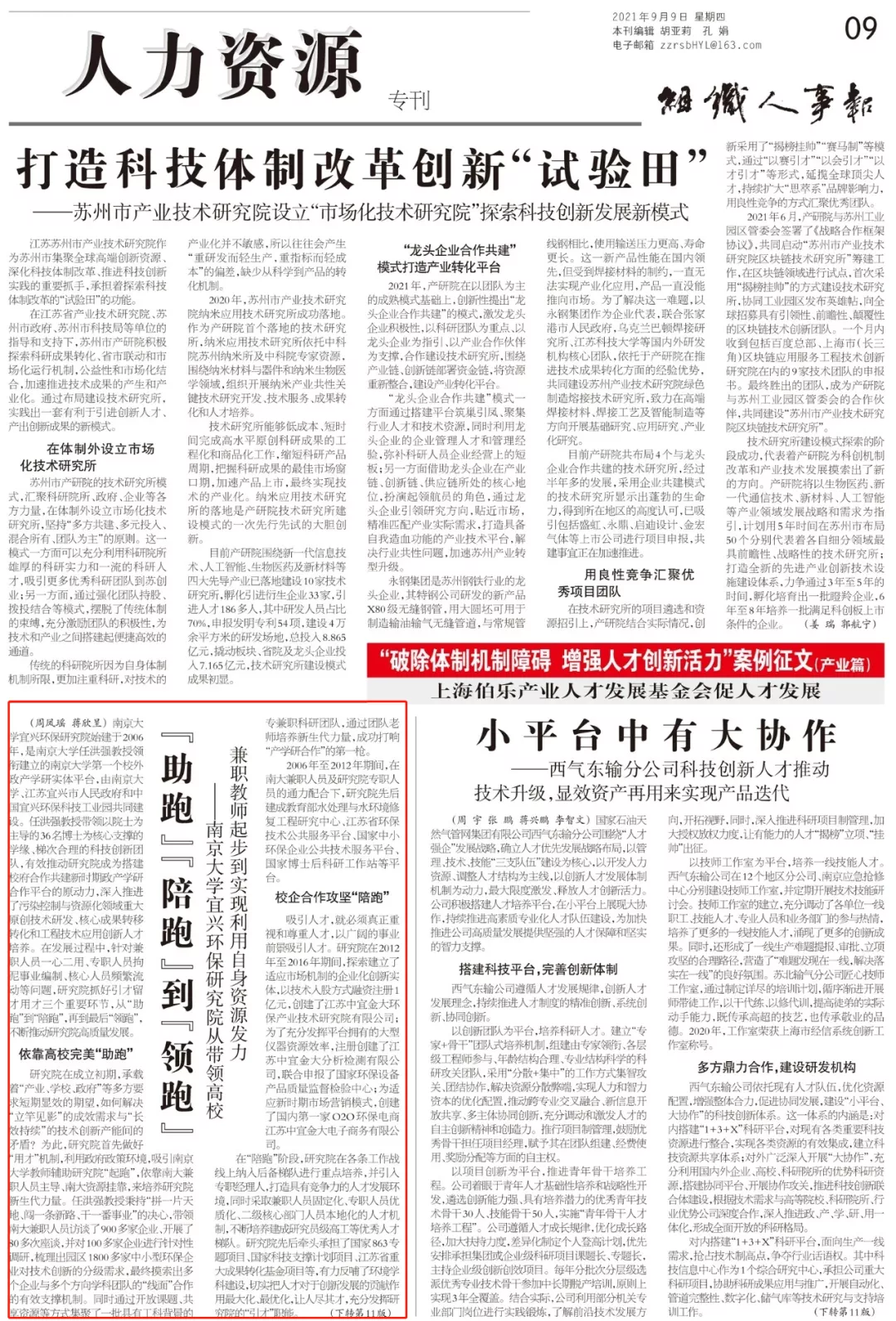 《组织人事报》刊登基地筹建单位南京大学宜兴环保研究院人才团队建设纪实