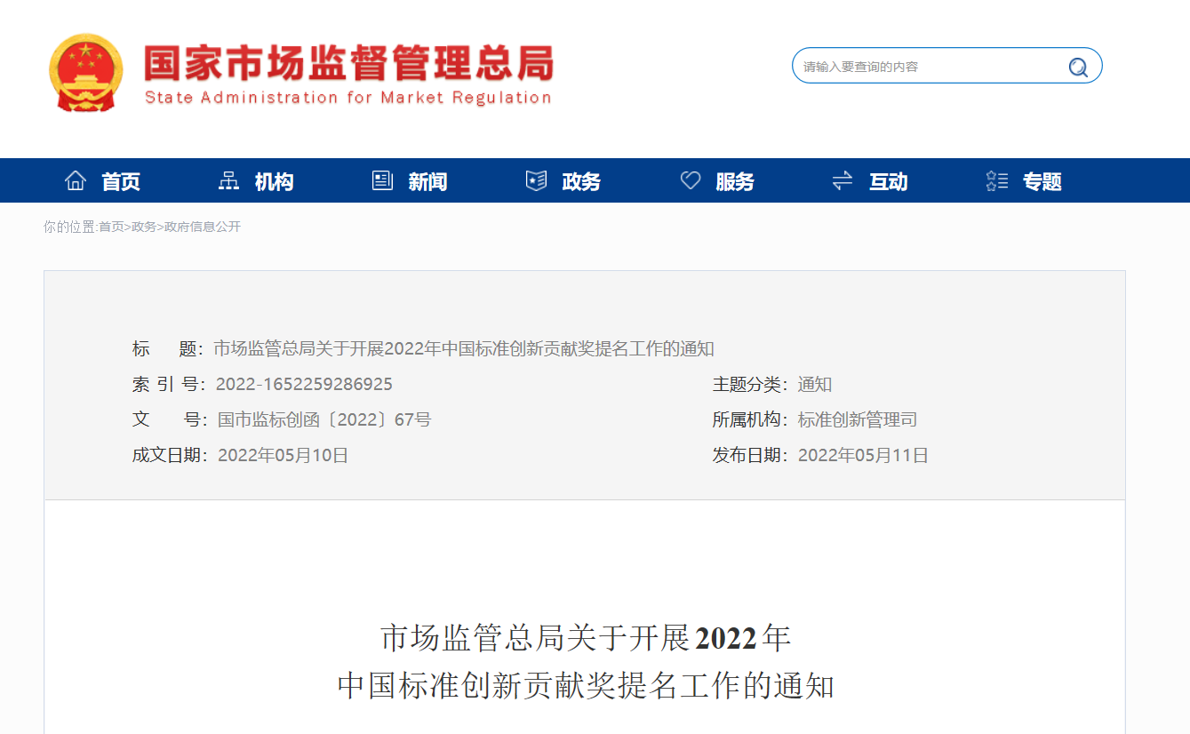 通知|市场监管总局关于开展2022年中国标准创新贡献奖提名工作的通知