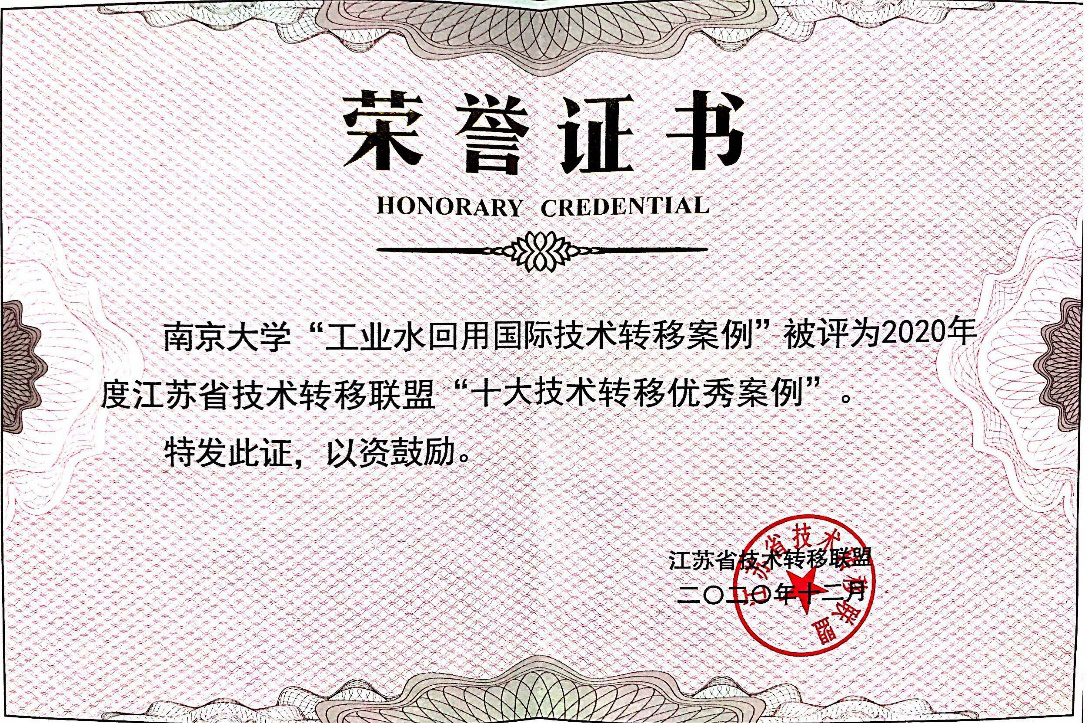国家技术标准创新基地(水环境技术与装备)“工业水回用国际技术转移案例”获评2020年度江苏省技术转移联盟“十大技术转移优秀案例”
