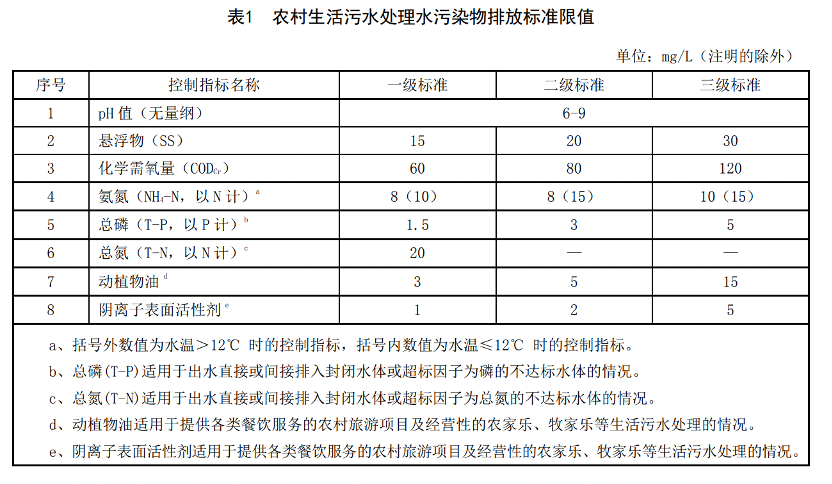 标准选取pH值、悬浮物、化学需氧量、氨氮、总氮、总磷、动植物油等指标。适用处理规模在500吨/日以下的农村生活污水处理设施。
